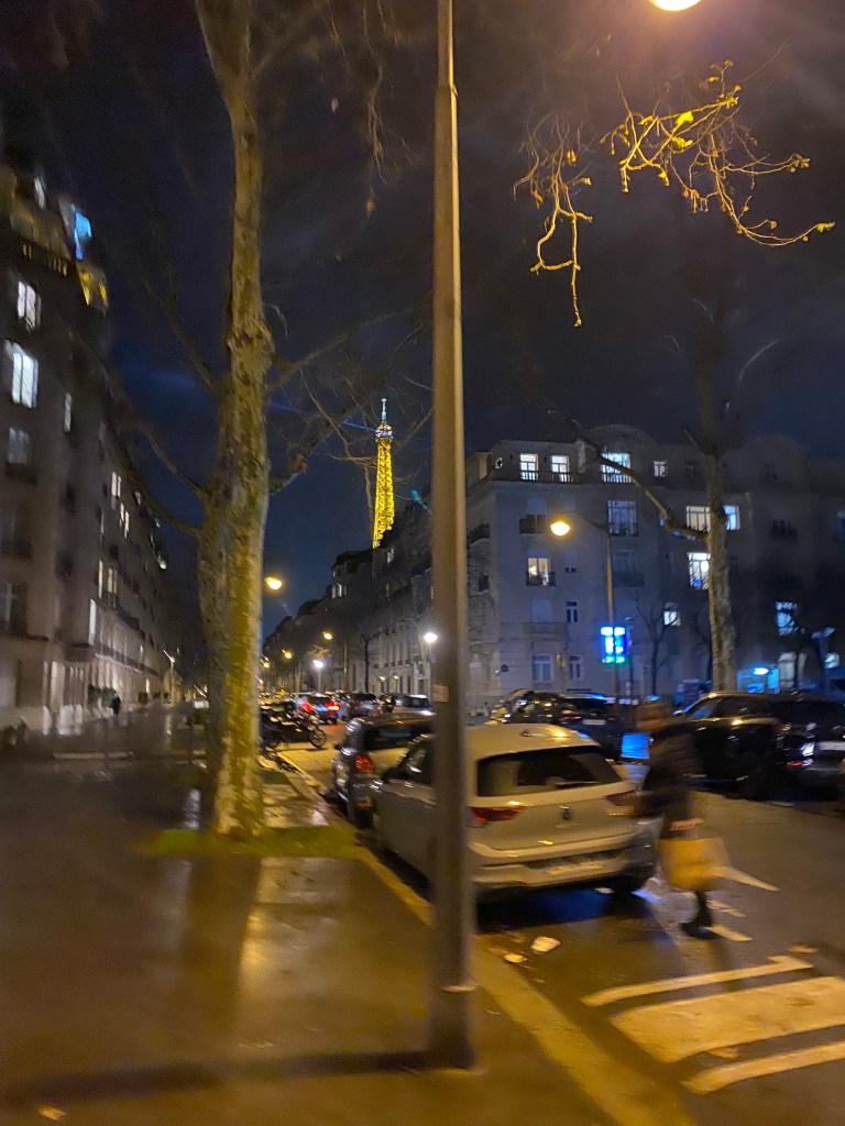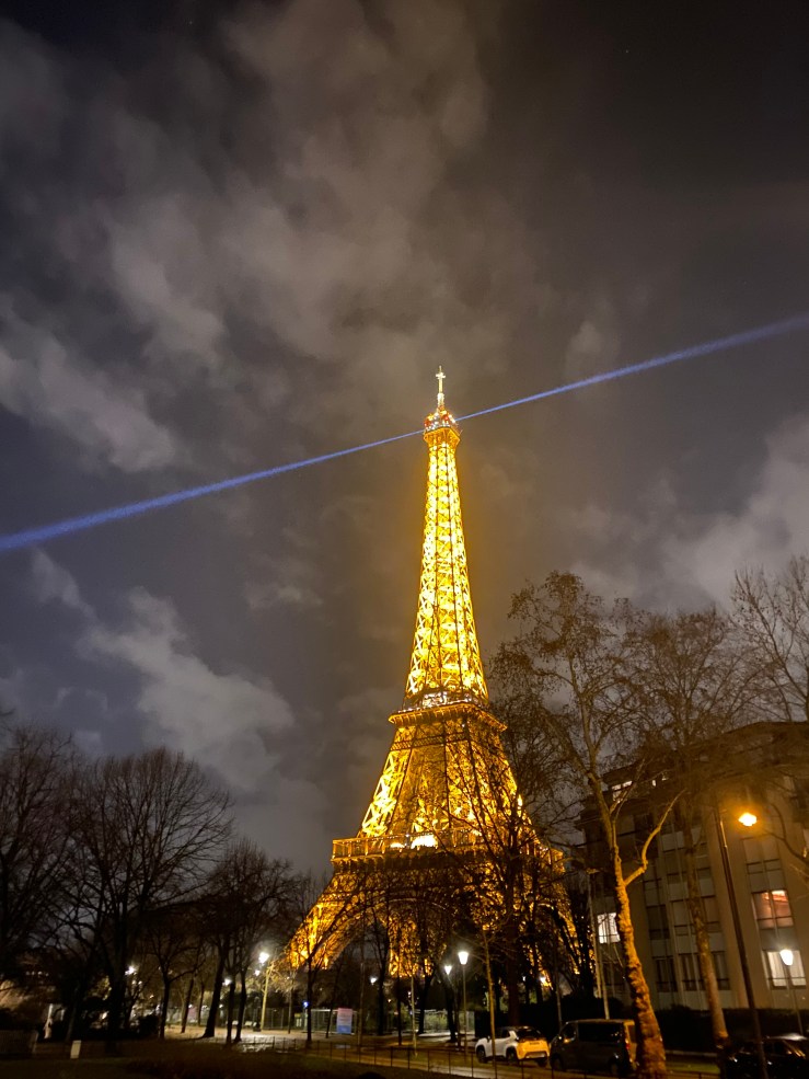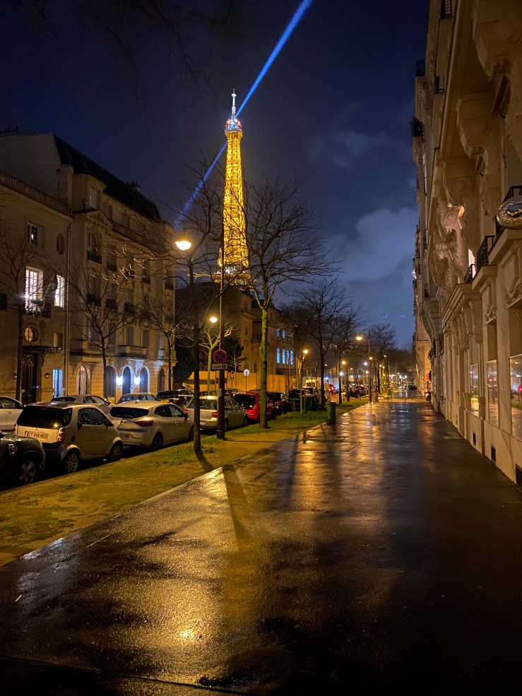 I chose a hotel in the 15th arrondissement for safety reasons, and it turned out to be a fantastic decision. As I walked, I noticed a strange blue light moving across the sky. Could it be the Eiffel Tower? Sure enough, as I kept walking, the tip of the Eiffel Tower came into view.