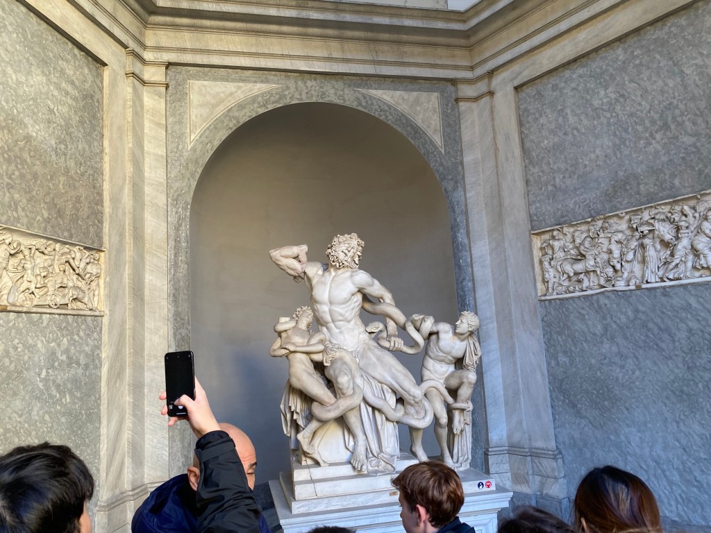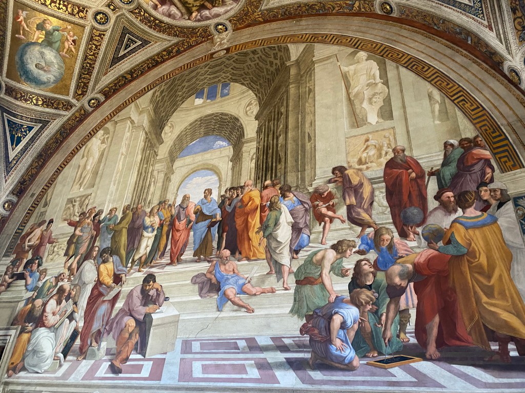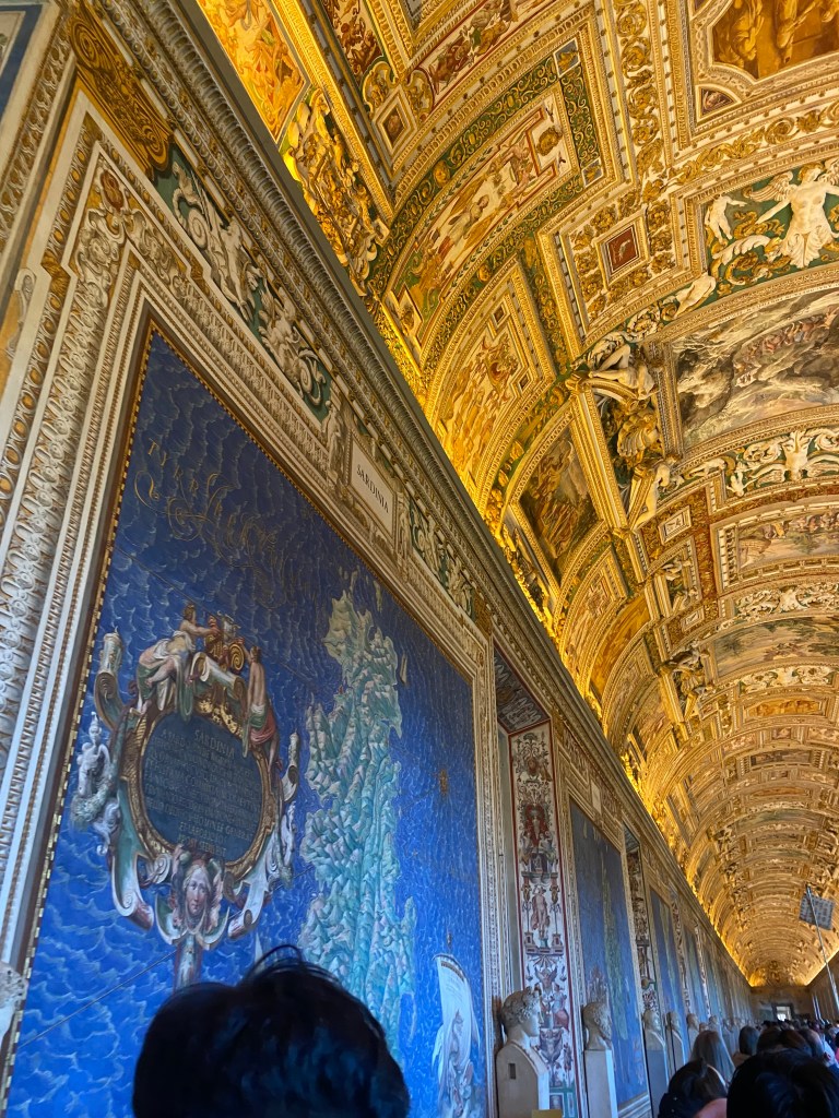 Had I been religious, I imagine the Vatican would have moved me profoundly. The interior was truly stunning—there was a sacred aura, as if the space were being watched over by something divine. Starting from the Pinacoteca (art gallery), we moved through various areas: the gardens, the Room of the Muses, the Room of the Candelabra, the Gallery of Maps, Raphael’s Rooms, and finally, the Sistine Chapel. Along the way, we heard explanations of the works and their historical contexts. The recurring thought that struck me throughout was about the interplay between art and religion.