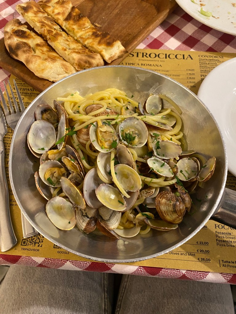 Once I arrived at Piazza Navona, I realized I was hungry. The only thing I had eaten that day was a sandwich inside the Vatican. Checking the list of recommended restaurants provided by the southern Italy tour guide, I found a place near Piazza Navona. The restaurant was called Mastrociccia, specializing in Italian food. As soon as I arrived, I didn’t hesitate much and ordered Vongole pasta and Prosecco. I chose Vongole pasta because it was a type of pasta I hadn’t tried yet in Italy. I figured I’d regret it if I only ate carbonara for the entire trip.