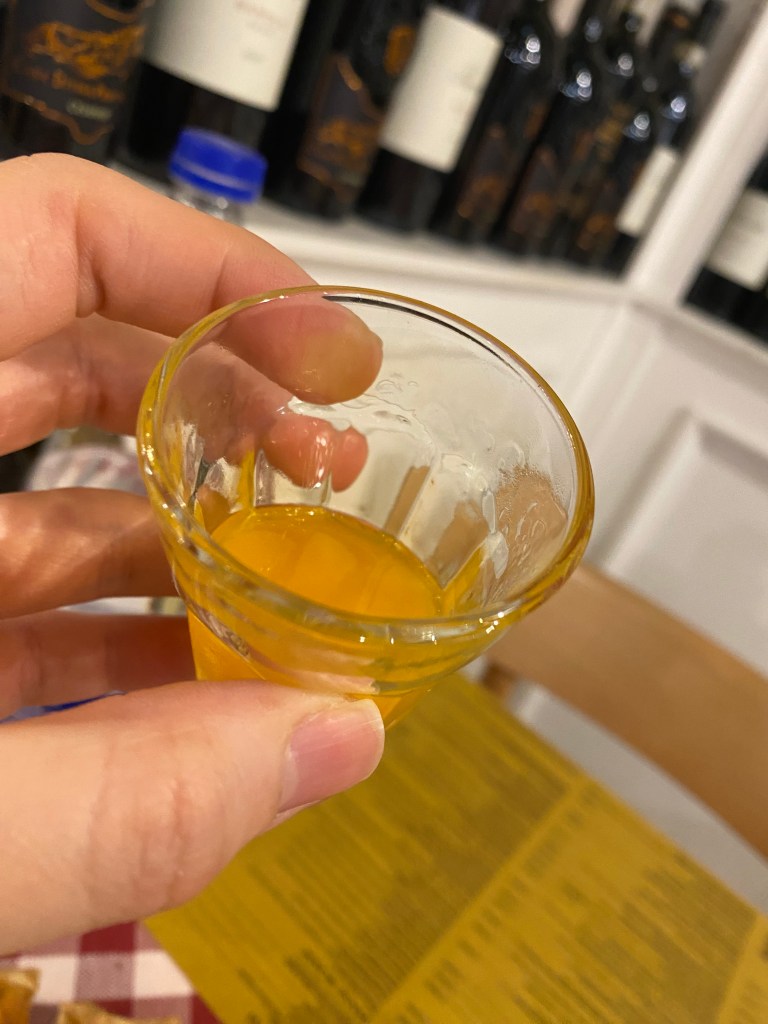 Meloncello had a completely different charm from limoncello. It was sweet yet surprisingly heavy. The taste caught me off guard, and I instinctively looked over at the waitress, who smiled and asked how I liked it. I jokingly wailed, This is too heavy!, but I finished it anyway—after all, it was free.